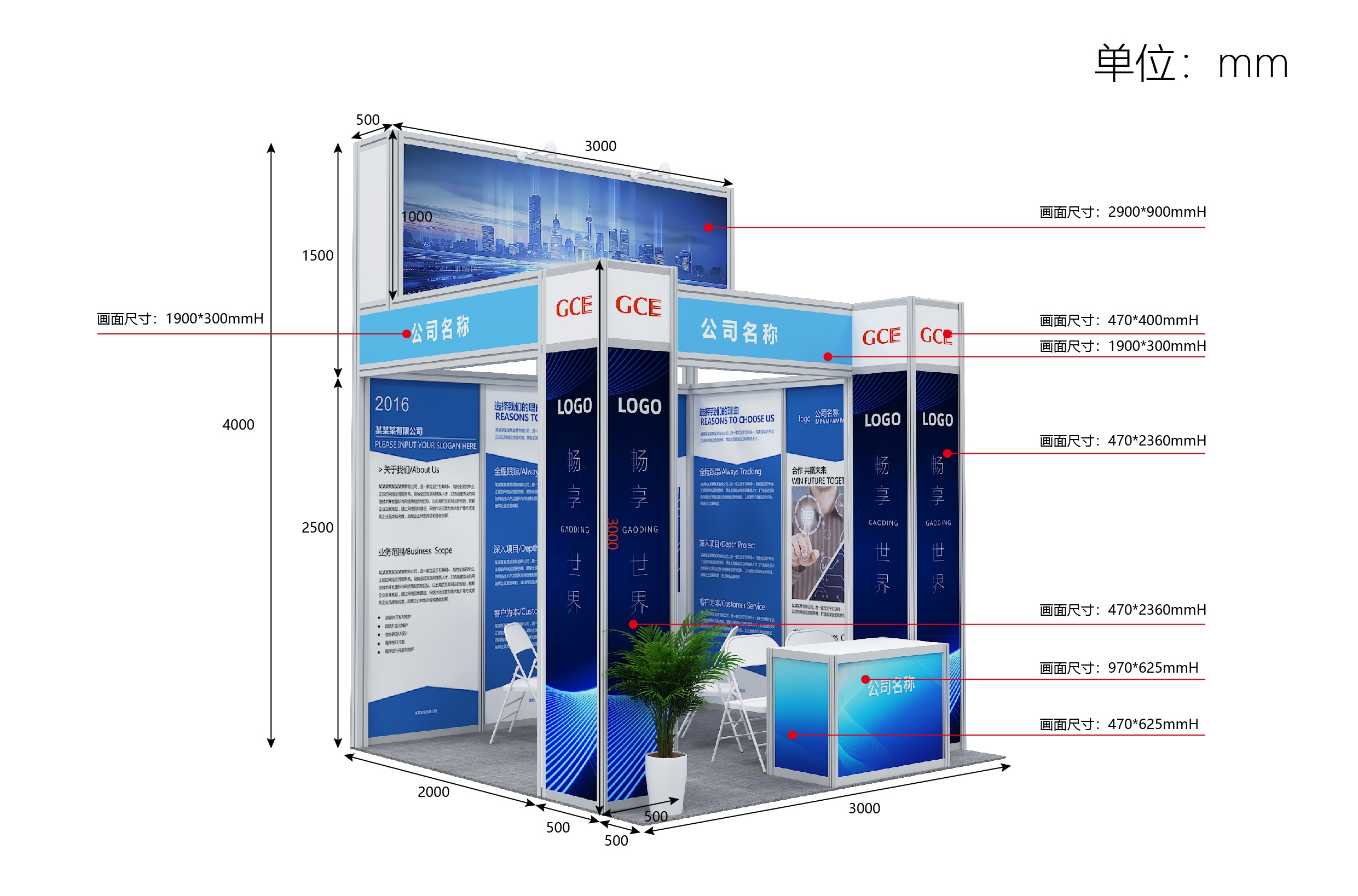 展位配置:高度4米、展位海报画面包含:(形象展区背板画面、展位围板画面、灯箱画面、楣板画面、桌子画面)一张咨询桌、一张玻璃圆桌、六把折椅、一盆绿植、地毯、纸篓、两盏射灯、220V电源插座;注:所有画面需要展商自行根据尺寸设计,源文件打包发到主办对接人员。